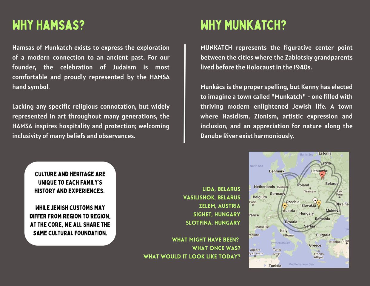 The design studio of Hamsas of Munkatch is guided by artist Channan Tzvi (Kenny Zablotsky); grounded in the belief that Judaism should be woven into the fabric of daily life. He celebrates the beauty of Jewish amulets such as the Star of David, Hamsa, and Evil Eye; utilizing gold and silver plated jewelry charms on mosaic art and sculptural objects.